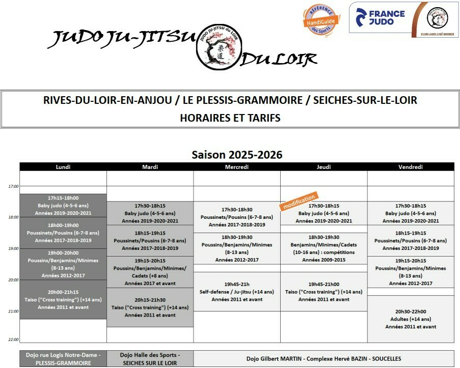 Après avoir consulté les parents des enfants concernés, le Bureau du JJJL a pris la décision d'ouvrir un 2ème cours pour les 4-5 ans le jeudi, à la place du cours des 6-7 ans. Cette modification est mise en place à partir de la semaine du 17 au 21 novembre 2025.
